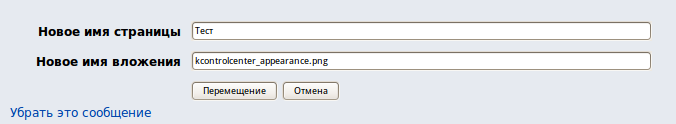 Ссылка действия «[переместить]» будет отображаться для каждого вложенного файла, если пользователю дана привилегия «delete» для страницы вики, к которой прикреплен этот файл. При выборе данного действия будет показан следующий диалог: