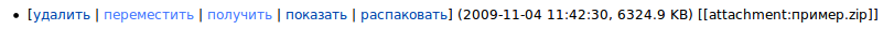 Если прав недостаточно, то действие в списке показано не будет: [получить | показать] (2009-11-04 12:08:06, 10.3 KB) [[attachment:пример.zip]]
