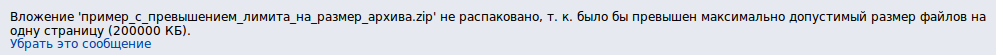 Если в результате распаковки суммарный размер прикреплённых файлов превысит разрешённый лимит, будет показано следующее предупреждение: